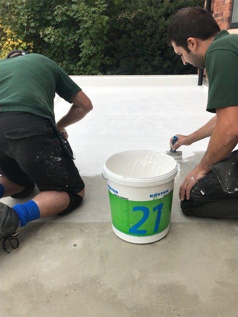 This meant that the only solution available was to remove the internal gutters and apply a Polysil Anti-Lime solution over the slab, before reforming the gutters using Koster Repair Mortar Plus along with a fillet around the perimeter of the deck, and applying two coats of Koster NB1 to the complete slab, lapping it up the walls. Once this had dried we then applied 3 coats of Koster 21 with flex fabric mesh applied to the first coat over the top of the NB1, returning over the fillet and up the wall.